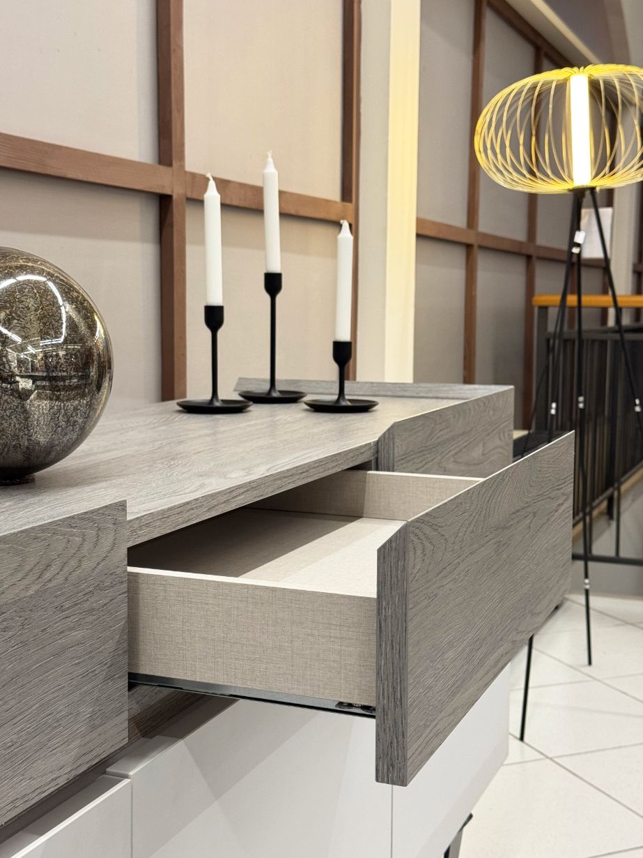 ELECTA dispone poi di tre cassetti realizzati in laminato impiallacciato dallo spessore di 1 cm sia sul fianco che sul fondo per garantire, nonostante il carico, la forma e la resistenza. Ogni cassetto si può estrarre totalmente, in modo da avere una visione completa dell’interno e poter agilmente prendere ciò che si desidera, mentre il sistema di freno, consente di attutire la chiusura.